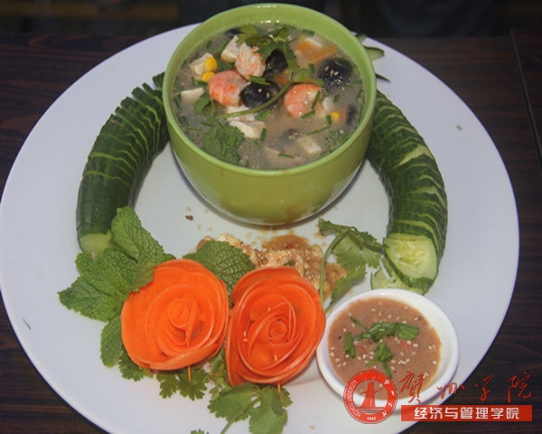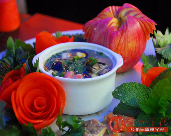 在淅淅沥沥的小雨中精彩纷呈的厨王争霸赛正式上演,随着雨势越来越大,赛况也进行得越来越激烈。本次厨王争霸赛以豆腐为主题,比赛时长为45分钟。在这45分钟内,来自各二级学院的代表队各施所长,使尽浑身解数,紧张有序地着手准备以豆腐为主题的美味佳肴。公司代表队选手杨斌钟和潘欣玲用苹果、胡萝卜、青瓜等食材雕刻出各种美丽且深含寓意的造型。在他们的巧手下,美味的食肴与绝伦的食材调刻组合成了具有异曲同工之妙的拼盘。